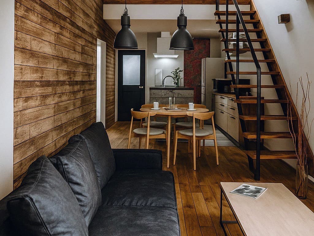 リビングに床から吹抜まで広がる板張りや、コンクリートブロックで作ったキッチン腰壁、壁に這わせた鉄管など各所にちりばめられた素材が空間を飾るヴィンテージカフェスタイルのお家です。